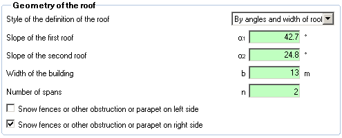 "Snow fences or other obstruction or parapet on left/right side" checkboxes are used in the calculation of the roof shape coefficients. If TRUE, obstruction exist, snow shape coefficient for that slope μ1(αi) is 0,8. If FALSE slow shape coefficient is calculated.